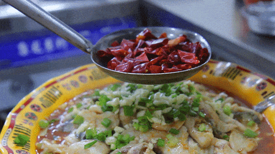 3分钟以后,把锅中的料渣捞干净以免影响口感。这个时候起锅,放入上过浆的鱼片,开大火快速滑煮20秒钟即可。出锅连汤带鱼一起倒入盘中,撒上葱花和蒜末。然后我们烧一点热油,油温七成热时起锅,把热油先浇在干辣椒上面激出香辣味,再倒在蒜末和葱花上面,美味即成。
