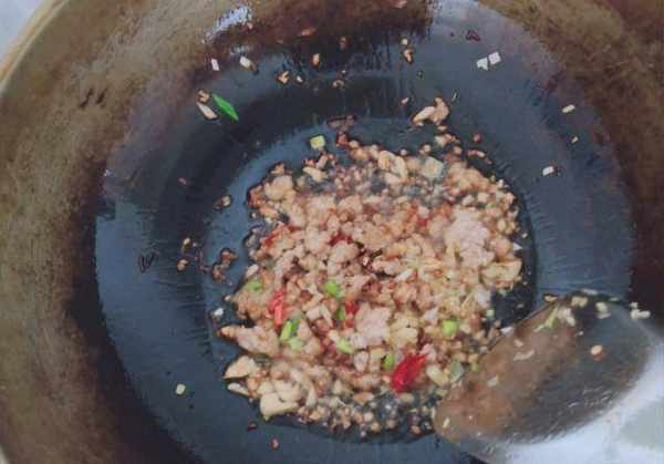 煎制豆角的油不要倒,开中火烧至七成热,放入肉末迅速翻炒,待肉末颜色变浅后,放入沥干水分的辣椒花椒和葱姜蒜末,快速翻炒出香味。