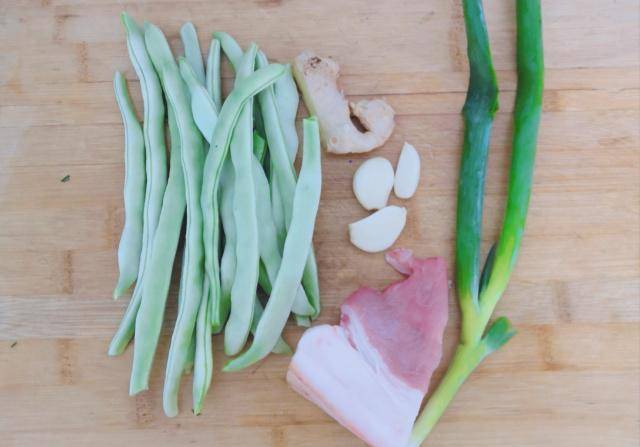 准备食材:猪肉50克、豆角200克、干辣椒2个、小葱1根、大蒜2瓣、生姜1小块、花椒10-15粒、食盐1.5勺、蚝油1勺、生抽2勺、食用油适量、鸡精少量。