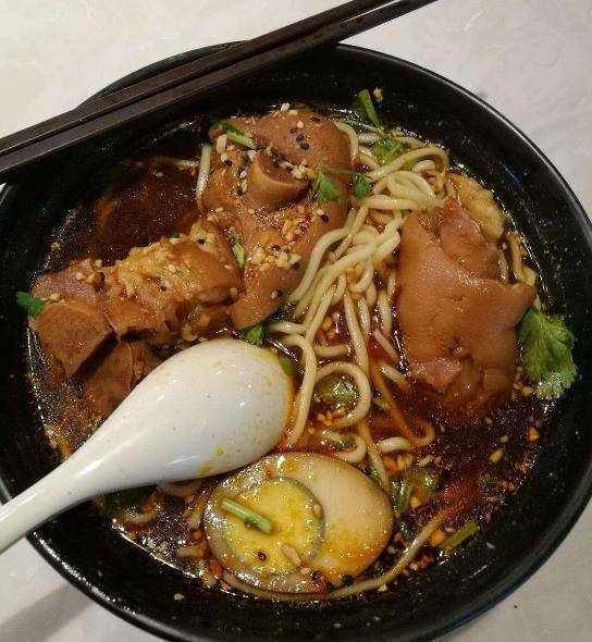 上图是一碗羊肉面,价格是68块钱,碗里除了面条之外,还有羊肉和葱花,除此之外就没有别的配菜了。而下图是一碗猪蹄面,比较良心,除了猪蹄之外,还带半个鸡蛋,看上去丰盛很多,价格是58块。这两碗面的面条看上去不像是手工面,因为它们太整齐了,而且表面很光滑,也不像是刀能够切出来的样子。