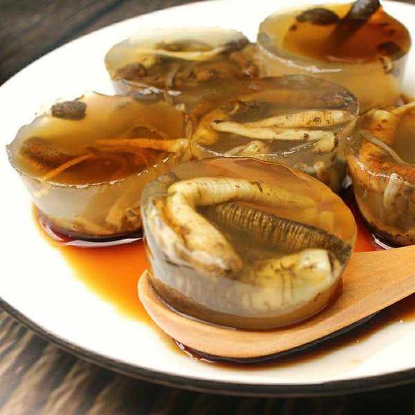 海虫冻让我感觉像在吃猪皮冻。当我看着光滑的表面,如果它是冰冻的,我感觉很好。当我们吃的那一刻,我们可以用酱油、蒜泥和小米混合酱汁。