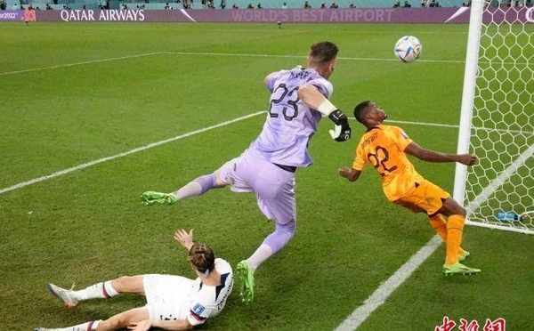 北京时间12月3日,卡塔尔世界杯八分之一决赛,荷兰队对阵美国队。最终,荷兰队3:1战胜美国队,率先闯入八强。图为美国队进球瞬间。中新社记者 崔楠 摄
