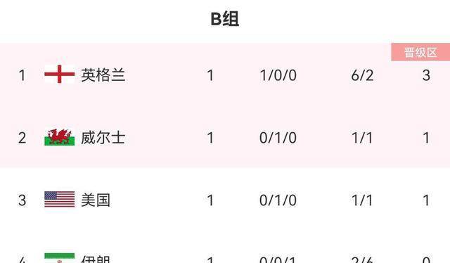 截止小组第一轮,英格兰3分+4个净胜球,令人跑B组积分榜,威尔士与美国同积1分位列2-3名,伊朗0分不幸小组垫底。