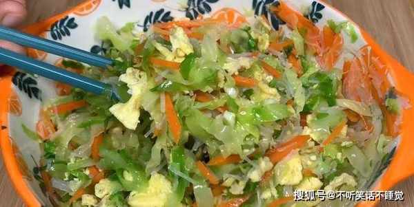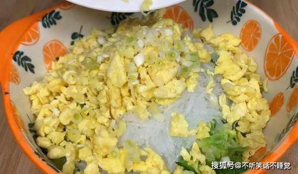 10.大碗中依次放入胡萝卜丝、包菜丝、鸡蛋碎、切碎的粉丝、葱姜末。
