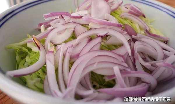 2.洋葱也同样切成细丝,抖散开和包菜放一起。