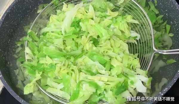 9.接着又倒入包菜,焯水1分钟,控水捞出。