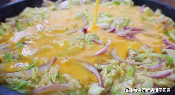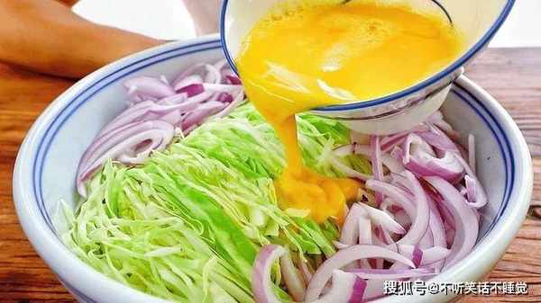 3.碗中打3颗鸡蛋,用筷子搅散,倒入包菜中。