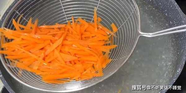 8.起锅烧水,水开加一勺食盐,几滴食用油,倒入胡萝卜丝焯水2分钟,控水捞出备用。