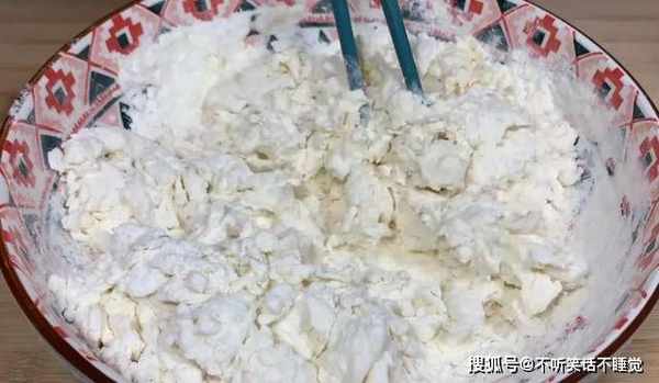 1.碗中倒300克面粉,加一勺食盐搅匀,再少量多次倒入开水,边倒边搅拌,搅成这样的絮状。