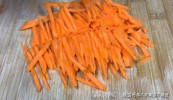 4.胡萝卜先切薄片,再切细丝,装盘备用。