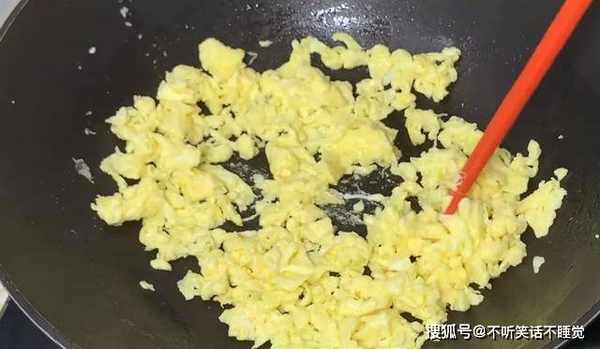 7.起锅放油,油热倒入鸡蛋液,开小火滑炒成这样的鸡蛋碎,盛出备用。