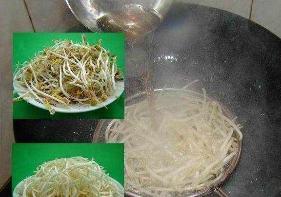 2.炒锅放火上,加入花生油烧至九成热时,放花椒炸过,将豆莛放入漏勺(密孔的),左手拿漏勺搁在油锅上,右手拿炒菜手勺,用手勺舀热油浇在豆莛上,反复浇几次;