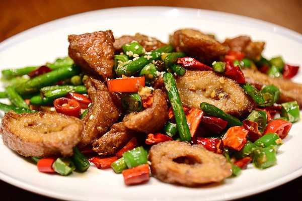 干煸脆皮大肠,色泽焦黄诱人,大块肥美浓香满口,一会就瓜分一空!