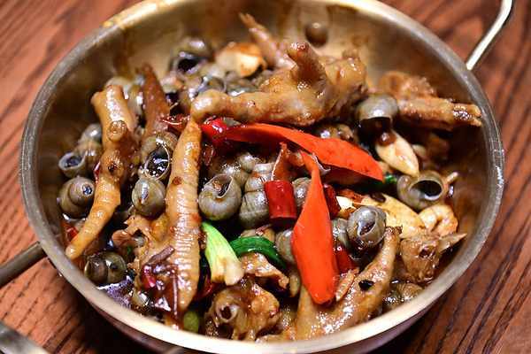 好欢螺鸡爪,田螺和鸡爪一同烹制,很有田园风味,田螺鲜香鸡爪够味,边吸边啃,不亦说乎。
