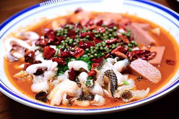 水煮三鲜,大大一盘份量十足,有好多洁白细嫩的鱼片、嫩脆弹牙的小管、新鲜Q弹的虾、肉香浓郁的午餐肉,麻辣鲜香好吃的停不下来。