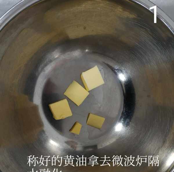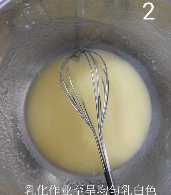 3、B盆中放入称好的黄油(图1),拿到微波炉,隔热水化开成黄油液体,加入白糖、牛奶、玉米油。用手动打蛋器进行乳化作业,搅拌均匀至白糖融化没有颗粒,混合液呈乳白色,如下图2
