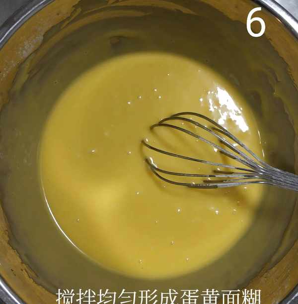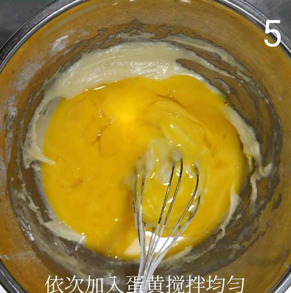 5、从装有鸡蛋液的A盆中,分离出蛋黄放入B盆,如上图5。先加一个蛋黄搅拌均匀后再加入下一个,以此类推。全部加完搅拌均匀后,形成的蛋黄糊放一边备用。如图6