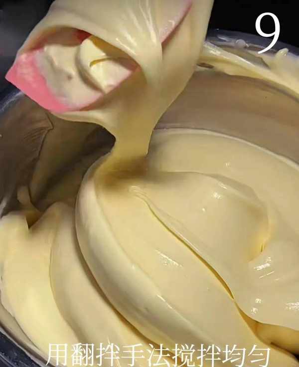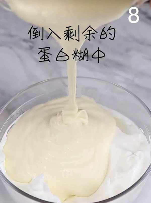 7、打发好的蛋清用软刮刀刮一些到边上备用的蛋黄糊里搅拌均匀(要从上往下翻拌或Z字型搅拌,不要划圈搅拌,以免蛋清消泡)