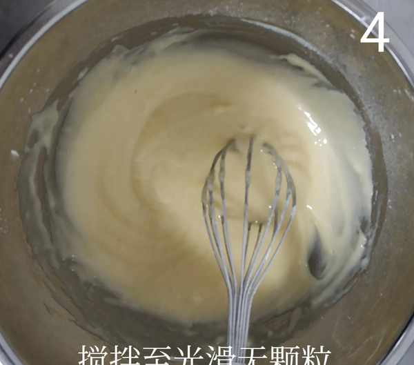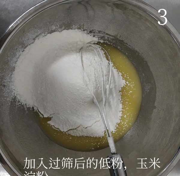 4、往乳白混合液里分别加入过筛好的低筋面粉和玉米淀粉,如图3。搅拌均匀至光滑无颗粒,如下图4