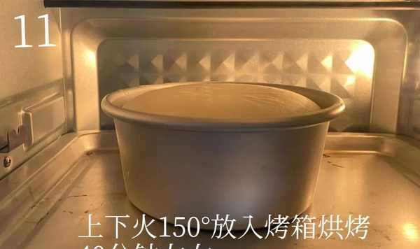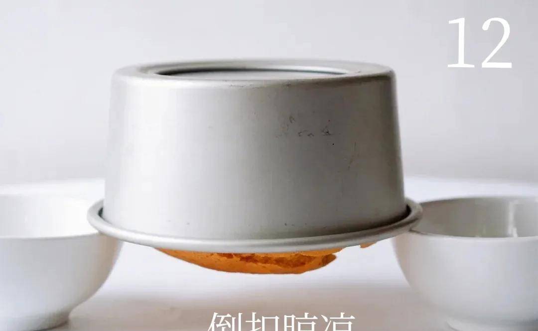 9、烤箱上下火150°放中层烤40分钟左右,每个烤箱温度不同,小烤箱体积小实际温度高,温度可以调低一点。烤好刚出炉的蛋糕,记得轻震2下,然后倒扣在晾凉架上冷却后再脱模。