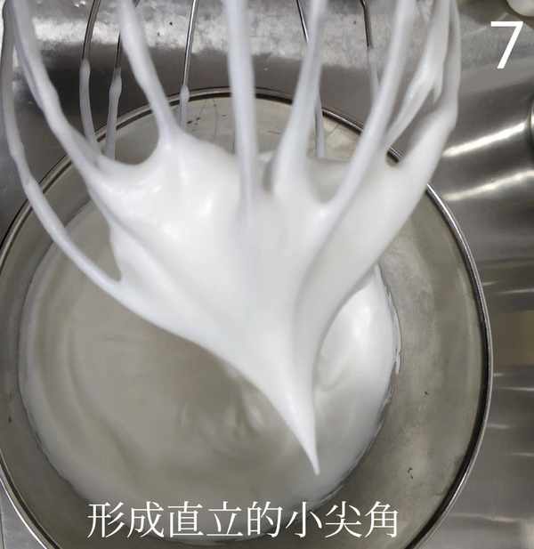 6、剩下蛋清的A盆中,依次加入柠檬汁,盐巴和白糖。白糖分三次加,先加约三分之一。打发至发泡,再加入三分之一,打发至泡沫细腻时剩余全部倒入(六寸量少,白糖我都一次性全部加进去再搅拌打发的)。打发至干性发泡,蛋白霜纹路清晰光滑,即提起打蛋头能竖起直立的小尖角。如图7