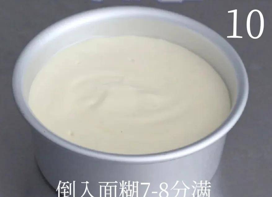 8、拌匀后的面糊全倒入剩下的A盆蛋白霜里,如图8,继续搅拌均匀至看不到白色蛋白霜后,如图9,装入六寸活底模具,7-8分满,然后用软刮刀抹平面糊,刮破表面气泡,也可提起模具轻震几下,震出气泡,如图10,然后放入预热好的烤箱开始烘烤。如图11