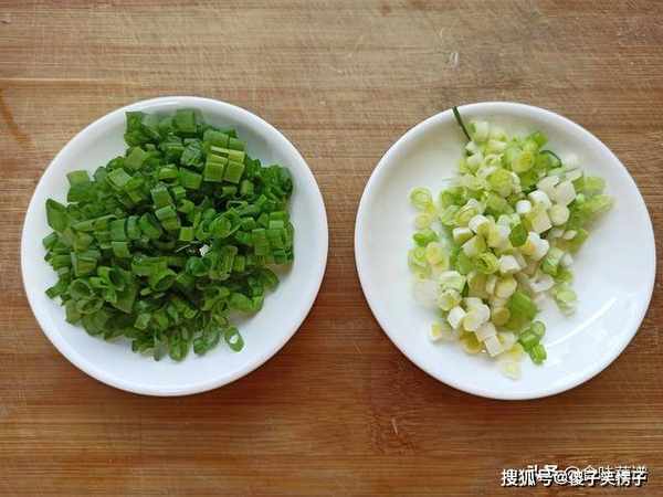 3、准备两根小葱,切成碎末,注意一个小细节,葱白和葱绿分开放。