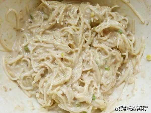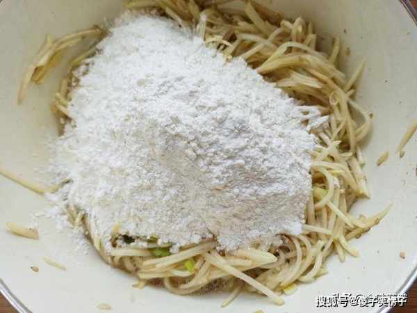 8、调成适中的黏稠度,面糊裹满了土豆丝,类似于老酸奶一样黏稠。