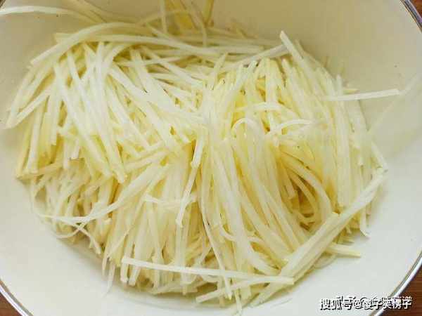 2、土豆削去外皮,用擦丝器处理成细丝,越细越好,刀功好的朋友,直接用手切。