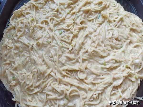 9、电饼铛或者平底锅,预热刷一层油,舀入面糊,平摊均匀,开中小火,盖上盖子,先烙3分钟。