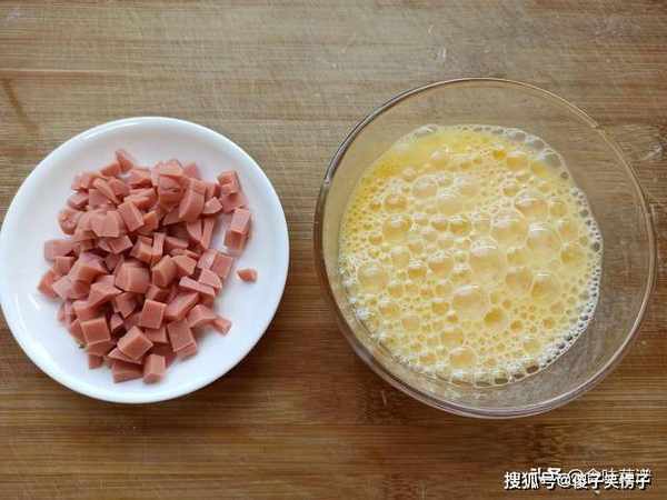 4、火腿肠剥掉外衣,切成长条后,再切小丁,鸡蛋打入碗中,加少量盐,搅拌均匀。