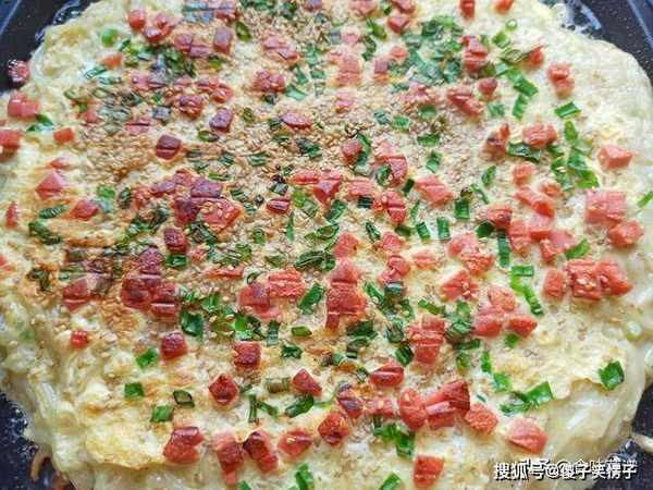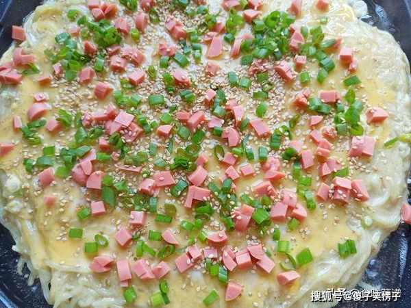 10、时间到了,在表面浇一个鸡蛋液,涂抹均匀,撒入葱绿、火腿肠和白芝麻,盖上盖子,在烙4分钟。