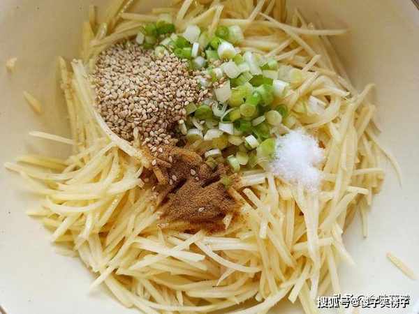 6、放入葱白,加入胡椒粉、熟白芝麻、食用盐,搅拌均匀入味,不吃辣的可不放。