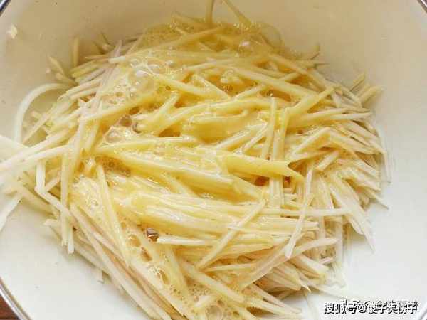 5、鸡蛋液浇在土豆丝中,用筷子充分搅拌均匀。