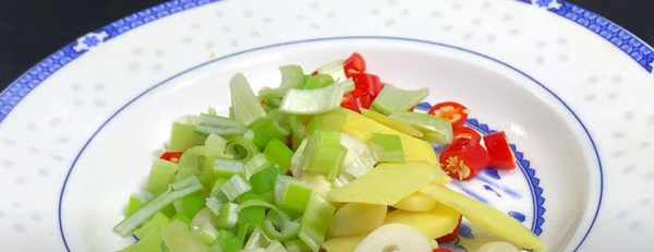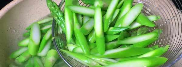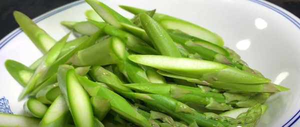 第5步、起锅烧水,水开后,放入少许的油和食盐,再放入芦笋进行焯水30秒左右即可捞出。焯水放盐和油是为了食材不变色。