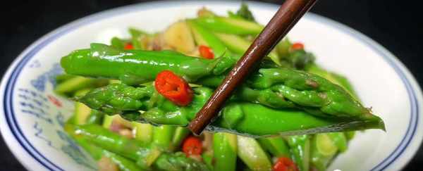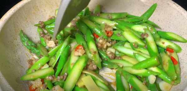 第7步、炒香后,再放入芦笋,这个时候开大火快速的翻炒,翻炒均匀。