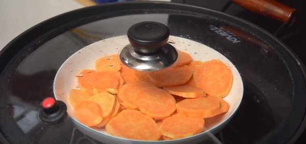 第1步、首先把红薯去皮,切成薄片,越薄越好,可以减少蒸制的时间,切好后放入蒸锅中,蒸煮15分钟左右。