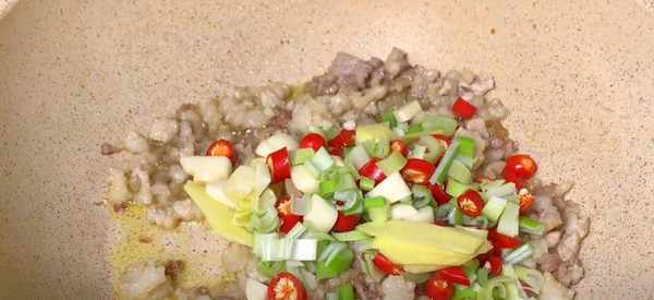 第6步、重新起锅热油,先将肉末炒制变色出油后,再放入葱姜蒜辣椒进行炒香。
