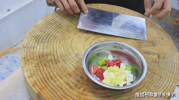 青椒和红椒各半片,分别切成菱形片,大葱破开切成葱花,大蒜切成蒜片,生姜切成姜片与葱,蒜放在一起。