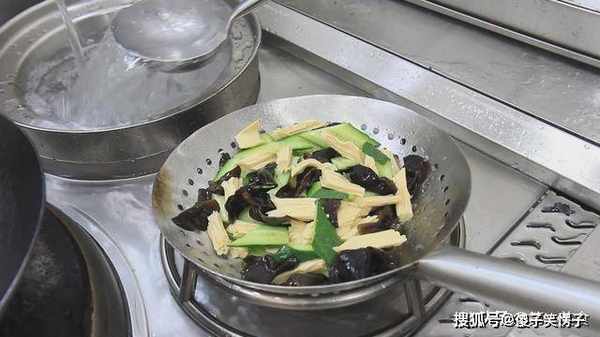 翻炒出葱蒜的香味以后,加入腐竹、黄瓜和木耳继续翻炒均匀下面开始调味,加入