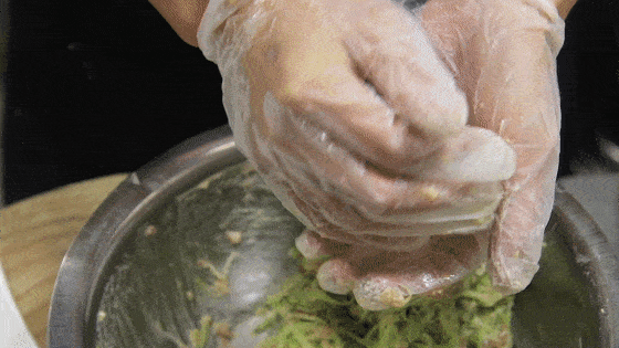 7.加入植物油不容易粘手,把馅搅拌好以后,取一个盘子抓一点馅,用双手来回的团