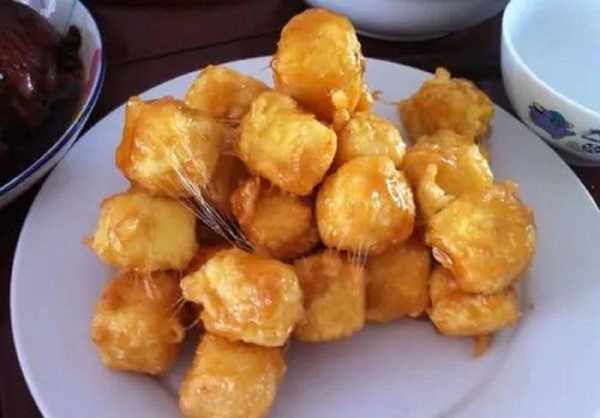 拔丝奶豆腐是当地一道传统的小吃,它用奶豆腐裹上蛋液炸制,再用白糖熬化的糖浆翻炒。