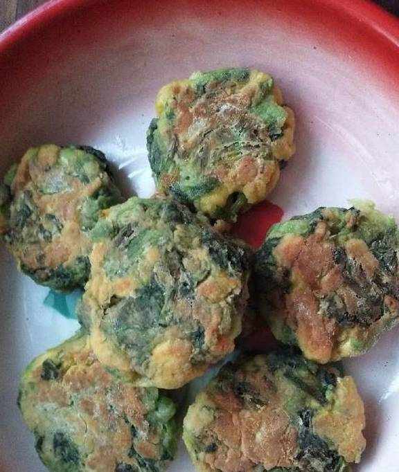 我们这代人的童年是看着《大力水手》长大的。印象最深刻的就是每当大力水手能量不足时就大口地吃菠菜,瞬间就会变得无比的强大。所以,在我们的眼中,菠菜可是个好东西。但是,孩子却不喜欢吃。为了让孩子多吃菠菜,补充维生素,我是想尽了法子。前些日子我打了菠菜汁和面条给孩子吃,今天突发奇想,试做了菠菜饼,孩子很喜欢吃。食材:菠菜一小把、鸡蛋两个、面粉适量做法:1、把菠菜用清水淘洗干净,开水焯一下,快速用凉水过一下(去掉草酸)后挤干水分,切成碎末。2、鸡蛋打入碗中搅拌成鸡蛋液,三分之二的蛋液倒入炒勺内炒熟切碎,与菠菜碎放在一起。倒入适量的油、盐、面粉搅拌均匀。3、把菜馅揉成圆球状,在蛋液中打个滚,再往菜团子上面撒上适量面粉,使其表面均匀地粘上一层面粉。一手加面粉,一手揉混面粉、鸡蛋和菠菜碎末,直至不散,成团,依次团好一个个菠菜团子。