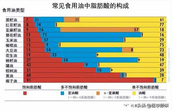 如下图所示,不同食用油中的脂肪酸组成差异很大。