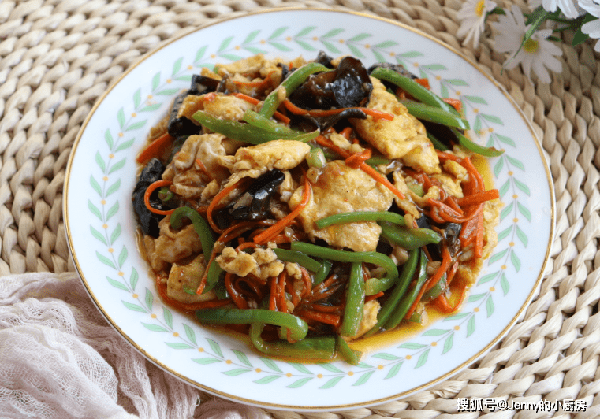接着放入胡萝卜、青椒、木耳翻炒,炒到胡萝卜变软,再倒入鸡蛋翻炒均匀。