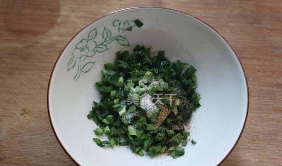 2.把韭菜切细、加入适量盐、油、花椒粉、调均。
