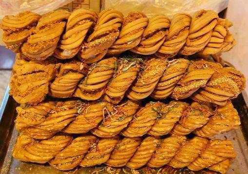 7.将大面饧好,切成大条,再将大条送入压条机,压成细面条,然后揪成长约35厘米的短条,并将条理顺。一部分作为光条,另一部分揉上麻仁作成麻条。再将和好的酥面作成酥条。按光条、麻条、酥条5∶3∶1匹配,搓成绳状的麻花(捏好咀)。