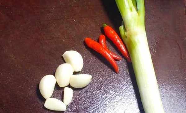 2.准备料头:小米辣两个切成圆圈备用,大葱一根切段备用,大蒜三瓣拍散切碎备用。
