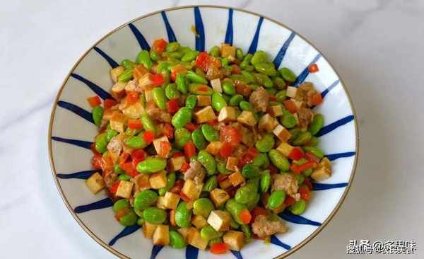 材料:毛豆仁1小碗(150克);香干2块;肉末50克;大红椒1个;蚝油半勺;生抽1勺;糖一小撮;盐适量;