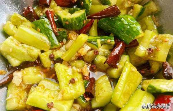 2、起锅烧油,油冒大烟关火,放干辣椒、花椒呛至颜色变深(约5、6秒),倒在装有黄瓜的大碗中。